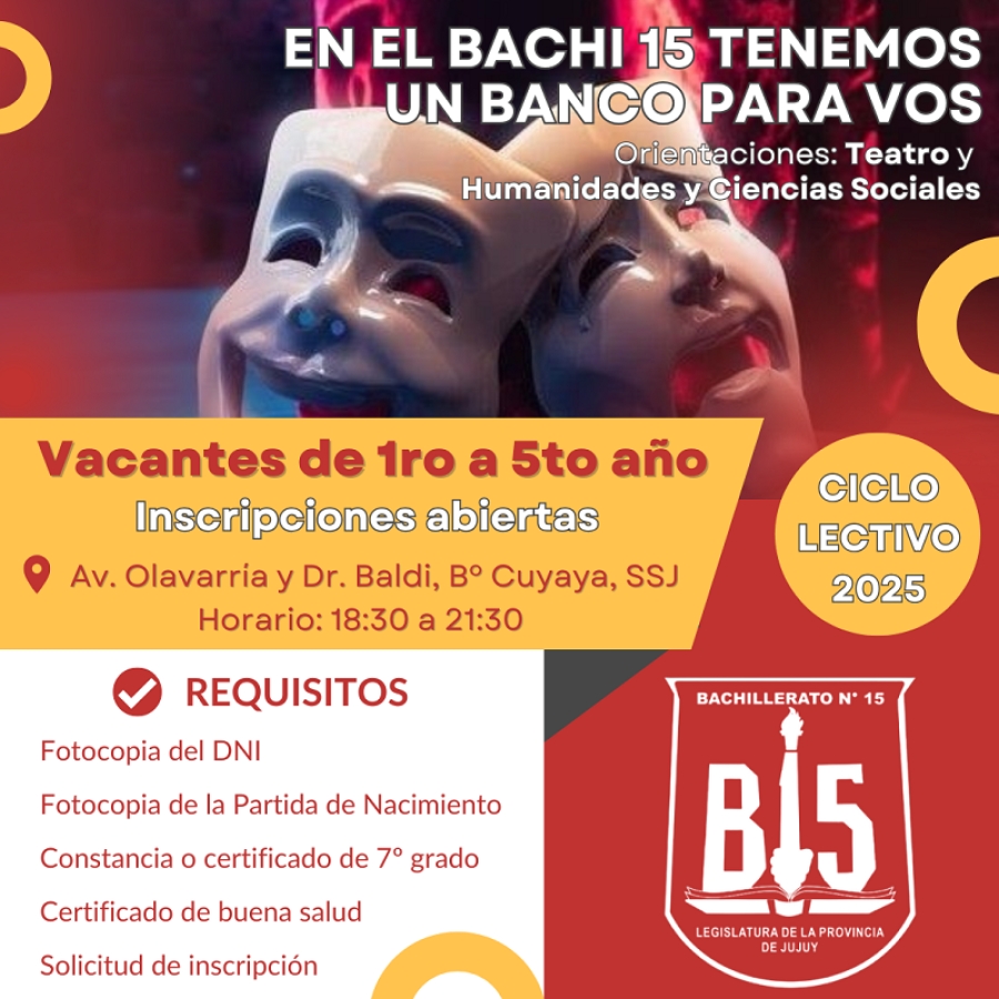 El Bachillerato Provincial N° 15 "Legislatura de Jujuy" cursó la invitación a los estudiantes a formar parte de su comunidad educativa para el ciclo lectivo 2025.