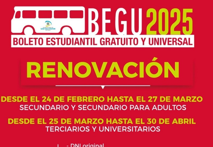 La Municipalidad de San Salvador de Jujuy, a través de la Dirección de Atributos Sociales, informa que mañana, 25 de marzo, comienzan las inscripciones para el Boleto Estudiantil Gratuito y Universal (BEGU) para estudiantes de nivel universitario y terciario. Este beneficio estará disponible hasta el 30 de abril, por lo que los estudiantes universitarios y terciarios podrán registrarse durante todo el mes de abril.