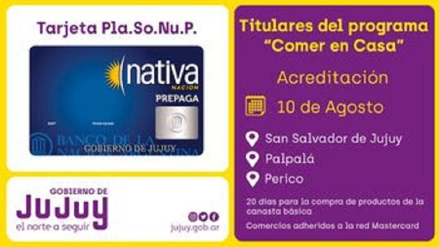 Cabe mencionar que la Tarjeta PLASONUP se acreditó con el monto de $ 5.000, y se implementó en las localidades de Capital, Palpalá y Perico, para titulares del programa "Comer en Casa”, que pertenece al Plan Social Nutricional Provincial.