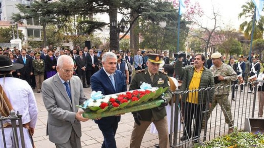 Luego, a los pies del monumento al general Manuel Belgrano, se realizaron tres ofrendas florales, una de parte del Gobierno de la Provincia, las Fuerzas Armadas y el pueblo de Jujuy, otra de la Municipalidad y por último también dejaron su homenaje los miembros del bloque legislativo Cambia Jujuy. Segundos después se llevó a cabo la invocación religiosa, a cargo del padre Alfaro.