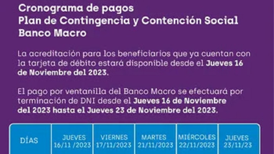 El Gobierno de la Provincia, a través de la Secretaría de la Unidad Coordinadora y Ejecutora de Planes y Programas Interministeriales, informa que la acreditación a beneficiarios que ya cuentan con tarjeta de débito del Banco Macro, estará disponible desde este jueves 16 de noviembre de 2023.