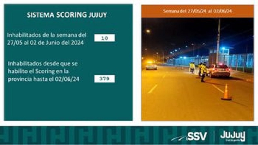 Total de siniestros: 67 Detalles de infracciones viales Alcoholemias: 113 Actas varias: 1.382 Actas por exceso de velocidad: 132 Vehículos controlados: 10.785 Sistema Scoring Jujuy Inhabilitados del 27/05 al 02 de junio de 2024: 10 Inhabilitados desde que inició el sistema scoring en la provincia hasta el 02 de junio de 2024: 379