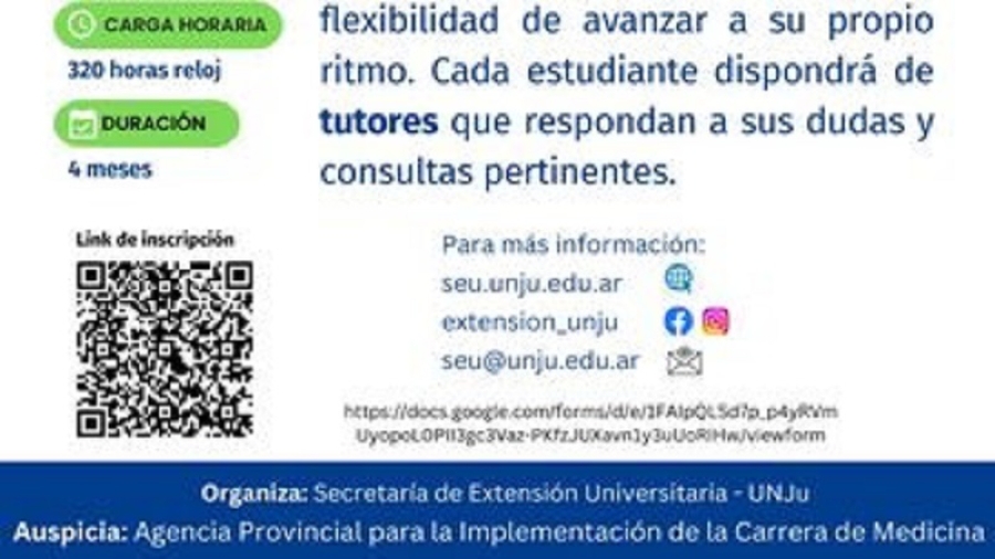 La Agencia Provincial para la Implementación de la Carrera de Medicina juntamente con la Universidad Nacional de Jujuy, a través de la Secretaría de Extensión Universitaria, lanzan el Curso de Nivelación para Carreras de Ciencias de la Salud, una propuesta educativa totalmente gratuita, que inicia el próximo 9 de diciembre.