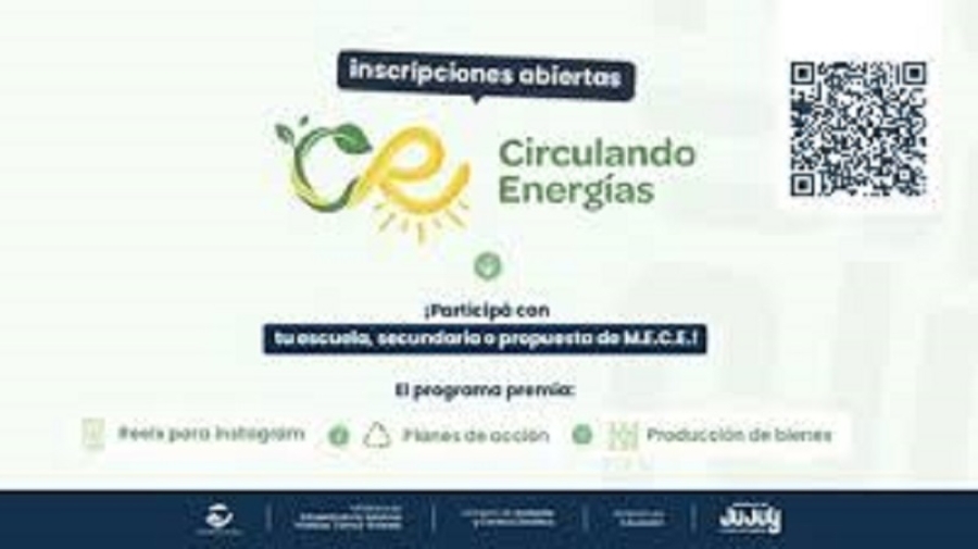 El Gobierno de Jujuy, a través de los Ministerios de Infraestructura, Servicios Públicos, Tierra y Vivienda (MISPTyV), de Educación y de Ambiente y Cambio Climático, informa que se encuentran abiertas las inscripciones para participar del Programa "Circulando Energías", e impulsado por la Secretaría de Energía del MISPTyV.