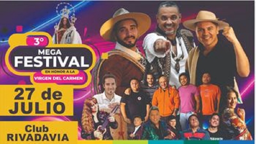 La Municipalidad de El Carmen, ultima detalles para el Tercer Mega Festival en honor a la Virgen el día sábado 27 de julio desde 20 horas en el Club Rivadavia de dicha localidad.