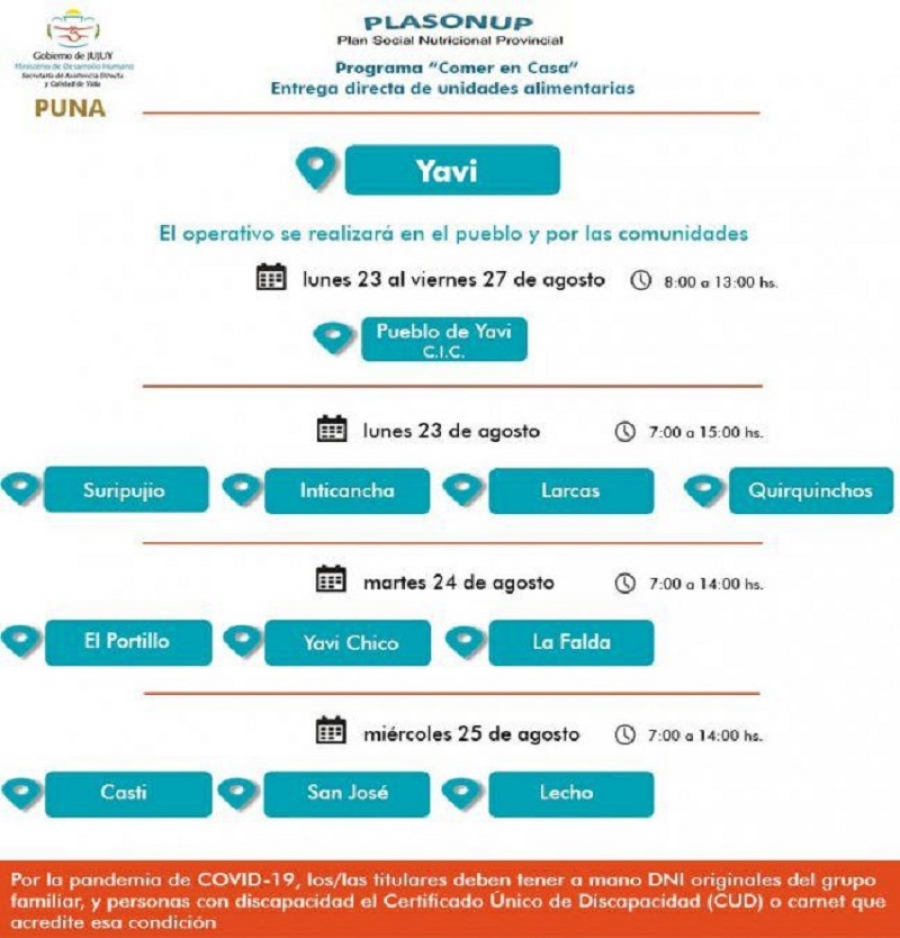 -Lunes 23, martes 24, miércoles 25, jueves 26 y viernes 27 de agosto, en el pueblo de Yavi, en el Centro Integrador Comunitario (CIC), en el horario de 8:00 a 13:00. -Lunes 23 de agosto, se ejecutará en las comunidades de Suripujio, Inticancha, Larcas y Quirquincho, en el horario de 7:00 a 15:00. -Martes 24 de agosto, en las comunidades de El Portillo, Yavi Chico, y La Falda, en el horario de 7:00 a 14:00. -Miércoles 25 de agosto, finalizará en las comunidades de Casti, San José y Lecho, en el horario de 7:00 a 14:00. La Secretaría recuerda a titulares tener a mano DNI originales del grupo familiar, y personas con discapacidad el Certificado Único de Discapacidad (CUD), o carnet que acredite esa condición.
