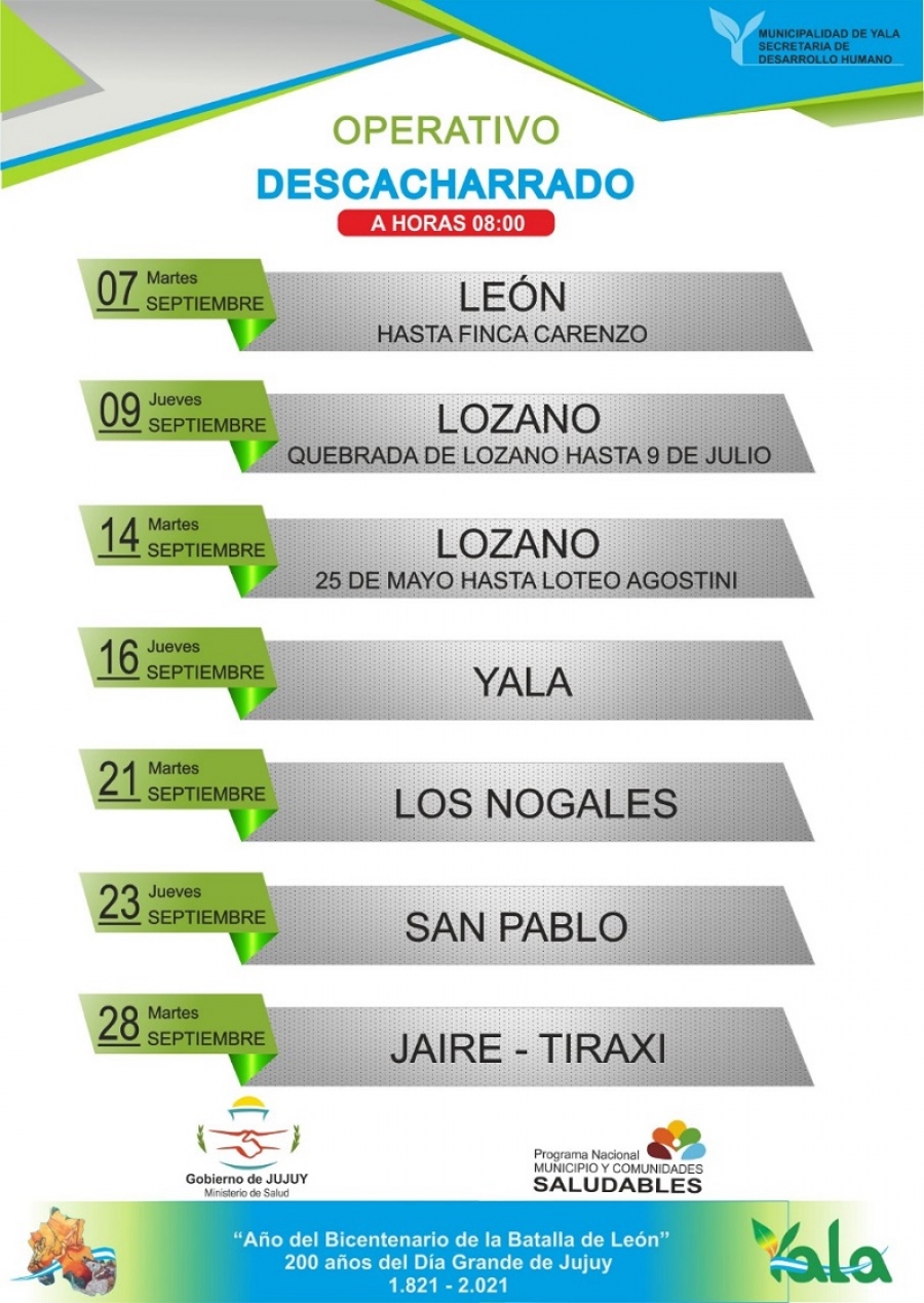 El jueves 16 de septiembre el operativo de descacharrado continuará en la localidad de Yala, el martes 21 en Los Nogales y el jueves 23 en la localidad de San Pablo.