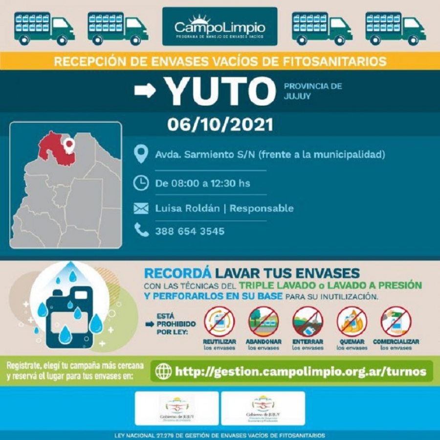El Ministerio de Desarrollo Económico y Producción invita a los productores agrícolas a sumarse a la campaña itinerante de recolección de envases vacíos de productos agroquímicos. La misma se llevará a cabo el día 6 de octubre en Yuto y Fraile Pintado.
