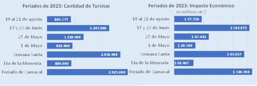 En el fin de semana largo por el Paso a la Inmortalidad del General José de San Martín, 865 mil turistas recorrieron el país, 4,9% más que el año pasado, y gastaron $37.736 millones. El impacto económico fue así 3,9% mayor que en 2022, a precios constantes.