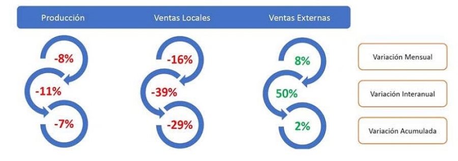 La reseña realizada por la CIQyP® muestra que las ventas locales cayeron 16% intermensual, afectada por todos los subsectores a excepción de los productos básicos orgánicos y los productos básicos inorgánicos, dado por menores volúmenes y precios de ventas. Para la variación interanual y el acumulado del año, también se observan valores negativos, 39% y 29% respectivamente, por los mismos motivos mencionados en producción y acumulación de stocks.