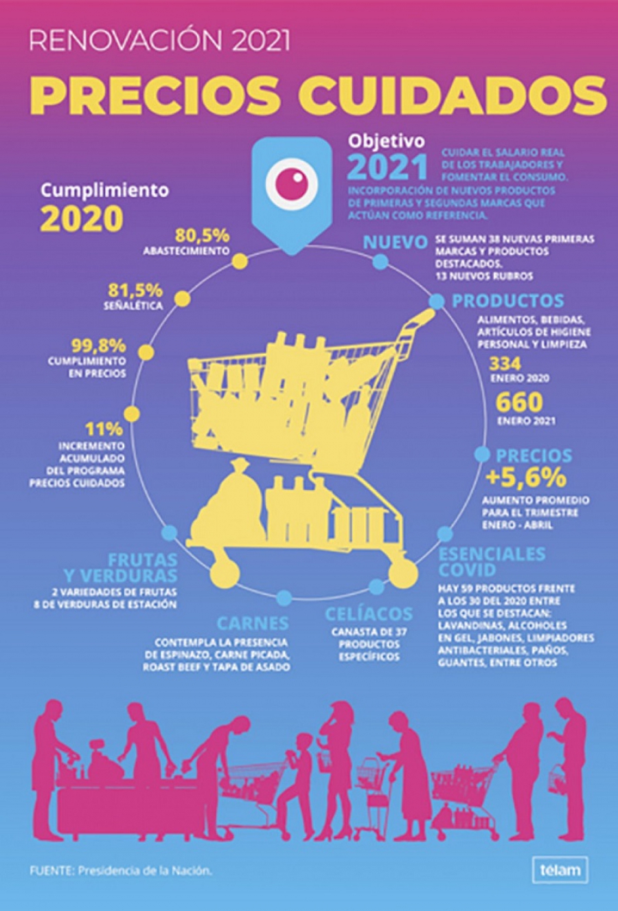 De esta forma, Precios Cuidados ofrecerá el doble de productos que en enero de 2020, con una canasta compuesta por 660 artículos de alimentación, bebidas e higiene personal y limpieza, entre otros rubros.
