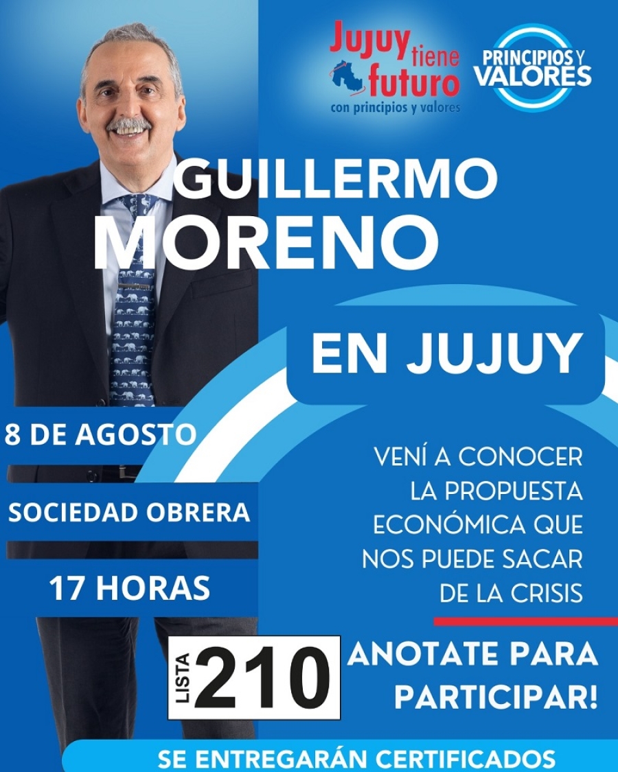 9:00 hs: En la sede de Jujuy Tiene Futuro con Principios y Valores, ubicada en calle Lamadrid N°262, Moreno se reunirá con empresarios Pymes, comerciantes, sindicalistas y estudiantes universitarios, marco en el cual desarrollará sus lineamientos para incentivar fuertemente la producción, el consumo, la educación y la inclusión social como único proceso posible de crecimiento e integración.