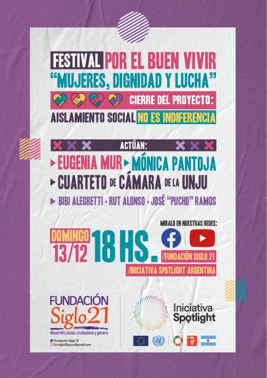 En el marco del Cierre del proyecto “Aislamiento Social no es indiferencia: promoviendo la articulación de actores estatales y la sociedad civil, para la prevención oportuna y eficaz de las violencias de género”, coordinado por la Fundación Siglo 21 e impulsado por la Iniciativa Spotlight Argentina, se realizará un festival virtual el Domingo 13 de diciembre 18 hs,