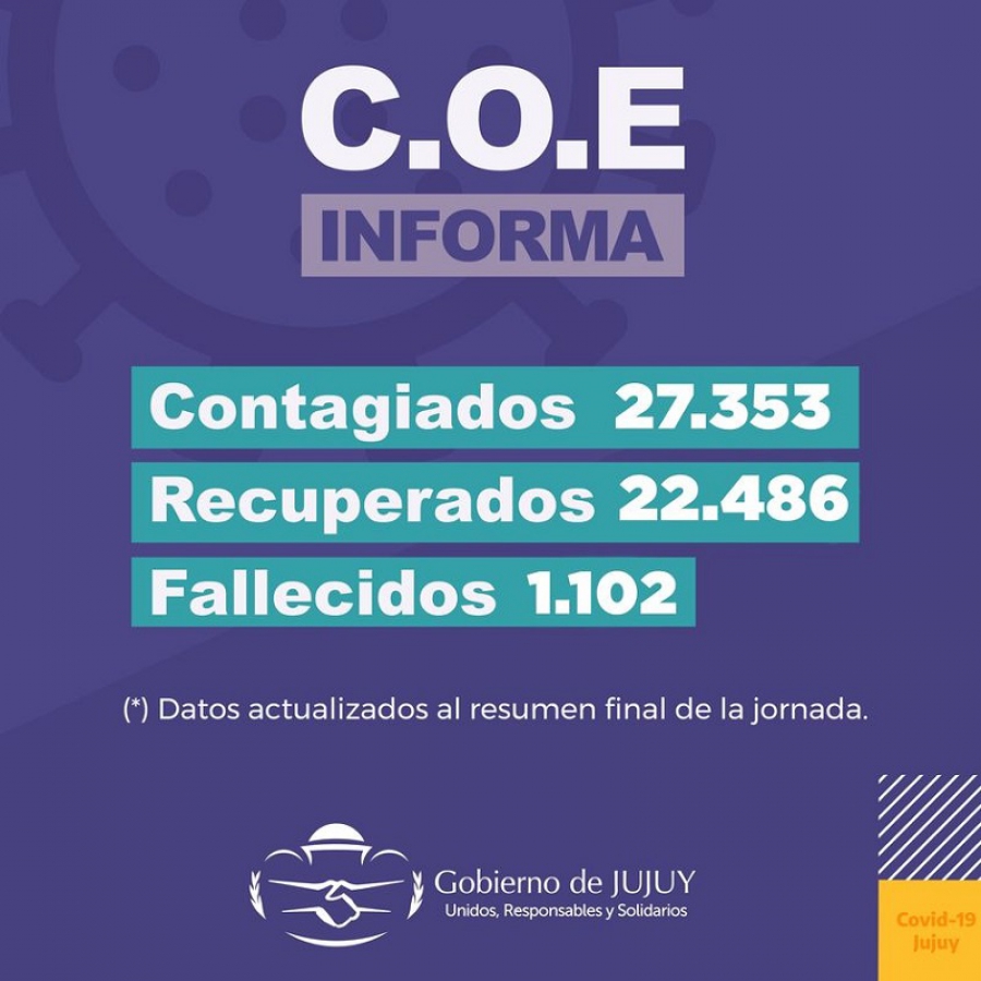 La Subdirección de Epidemiología informa en su Reporte diario que hoy se confirmaron 124 nuevos casos de COVID-19 en Jujuy y recibieron el Alta Médica 28 pacientes.