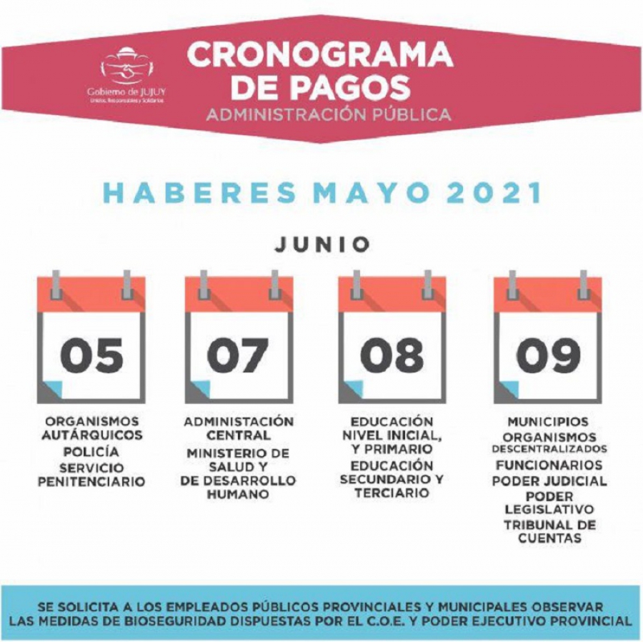 Tesorería de la provincia dio a conocer el cronograma de pagos correspondiente al mes de mayo 2021.