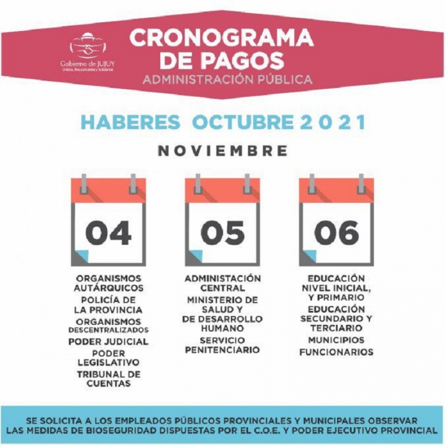 Tesorería de la Provincia dio a conocer el cronograma de pagos correspondiente al mes de Octubre 2021.