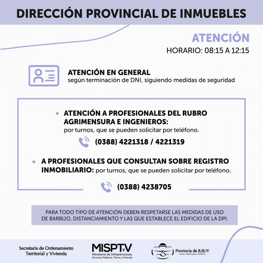 Matías Luna, director provincial de Inmuebles, señaló que “desde el inicio de la pandemia en la provincia tomamos las medidas necesarias para poder atender a la ciudadanía en óptimas condiciones sanitarias, de acuerdo a los protocolos de acción para la prevención del COVID-19”, y que “los horarios, modalidad y medios establecidos para la atención, responden a asegurar la atención en ese mismo sentido, preservando la salud de nuestros trabajadores como la del público de la DPI”.