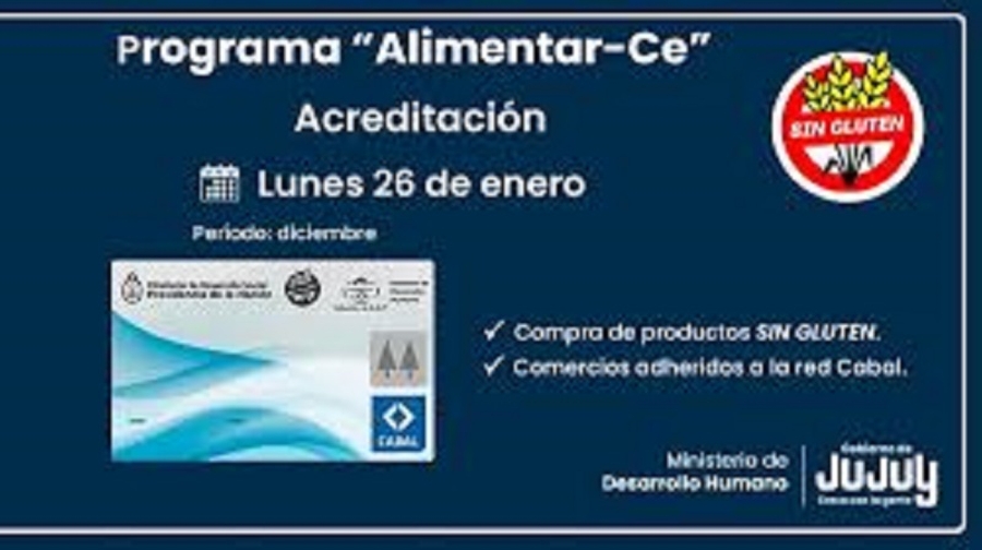 El Ministerio de Desarrollo Humano, por medio de la Secretaría de Asistencia Directa y , comunica que el lunes 26 de enero, se realizó la acreditación de la tarjeta Alimentar-Ce, destinada celíacos del programa “Alimentar-Ce”.
