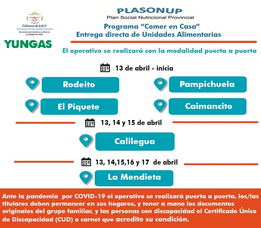 Según la Secretaría de Asistencia Directa y Calidad de Vida, el operativo de entrega directa se realizará únicamente con la modalidad de puerta a puerta, con la colaboración del Ejército Argentino y personal de los municipios, en cumplimiento al Protocolo de Actuación del Comité Operativo de Emergencias Provincial (COE), para proteger la salud del personal y de las personas beneficiarias; por lo que el personal que manipula los productos alimenticios, tendrá los elementos necesarios de protección, acorde a los protocolos sanitarios para el cuidado de la salud.