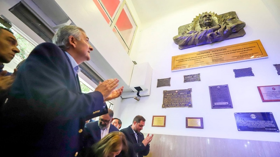 El presidente de la UCR y gobernador de Jujuy, Gerardo Morales, encabezó en la sede del Comité Nacional el acto de descubrimiento de una placa evocativa de la figura de Raúl Alfonsín, en el marco de una extensa serie de actividades especialmente programadas para conmemorar los 40 años de vida en democracia.