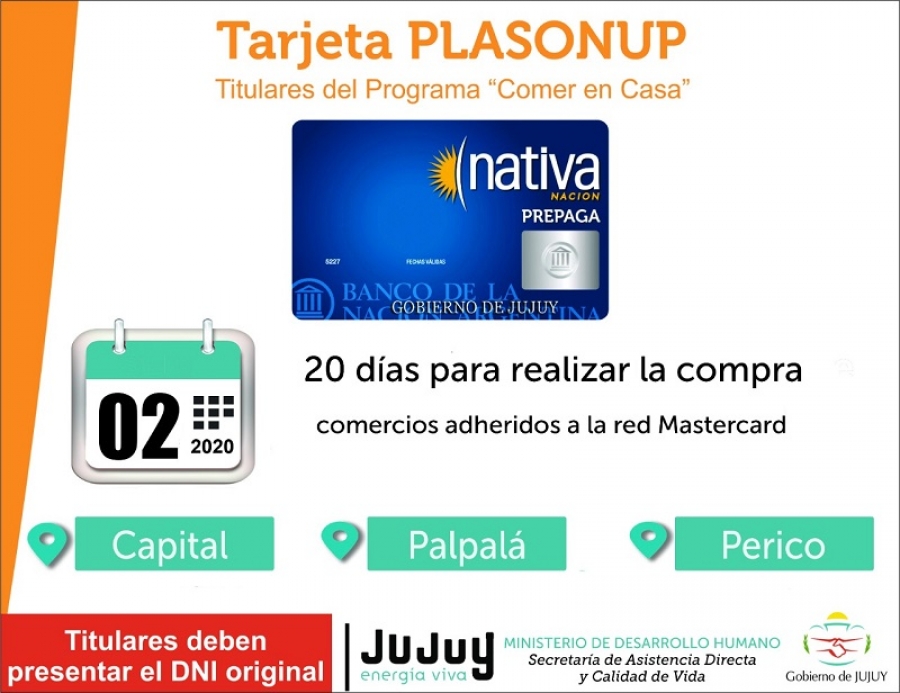 Desde la cartera provincial, se informó que la Tarjeta PLASONUP continúa vigente solamente en San Salvador de Jujuy, Palpalá y Perico, para titulares del programa “Comer en Casa” perteneciente al Plan Social Nutricional Provincial (PLA.SO.NU.P.). En tanto, que en el resto de las localidades continúa el sistema de entrega directa de Unidades Alimentarias.